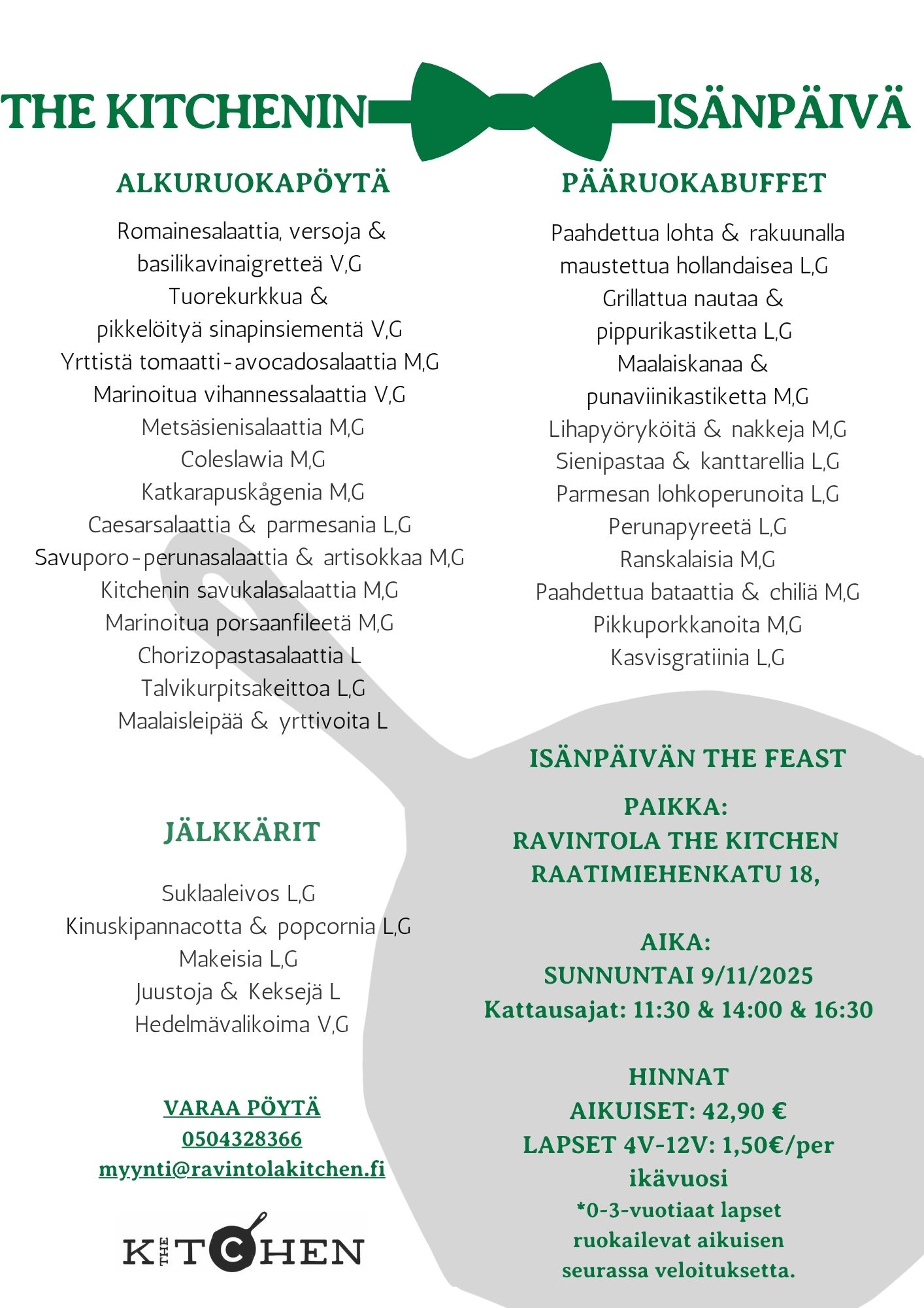 Isänpäivänä The Kitchenissä herkutellaan! Alkuruokapöytämme notkuu huumaavia makuja ja runsaan pääruokabuffetin antimia on valmistettu puuhiiligrillissämme.